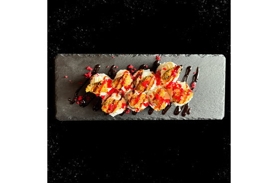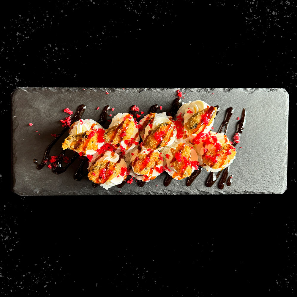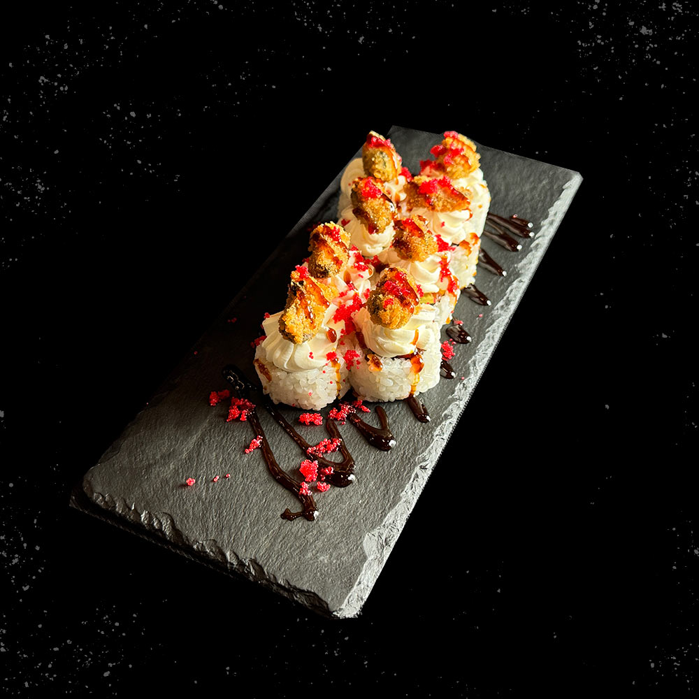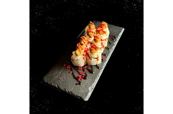 Состав: лосось, мясо мидий, сыр Cremette, такуан, кляр, сухари панировочные, рис, нори