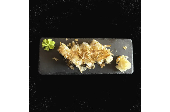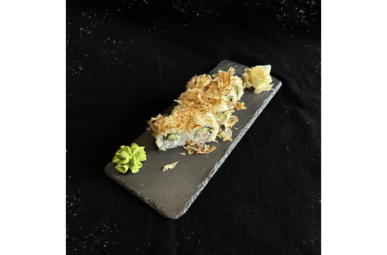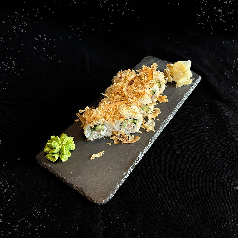 Состав: грудка куриная копчёная, сыр Cremette, огурец, стружка тунца, рис, нори